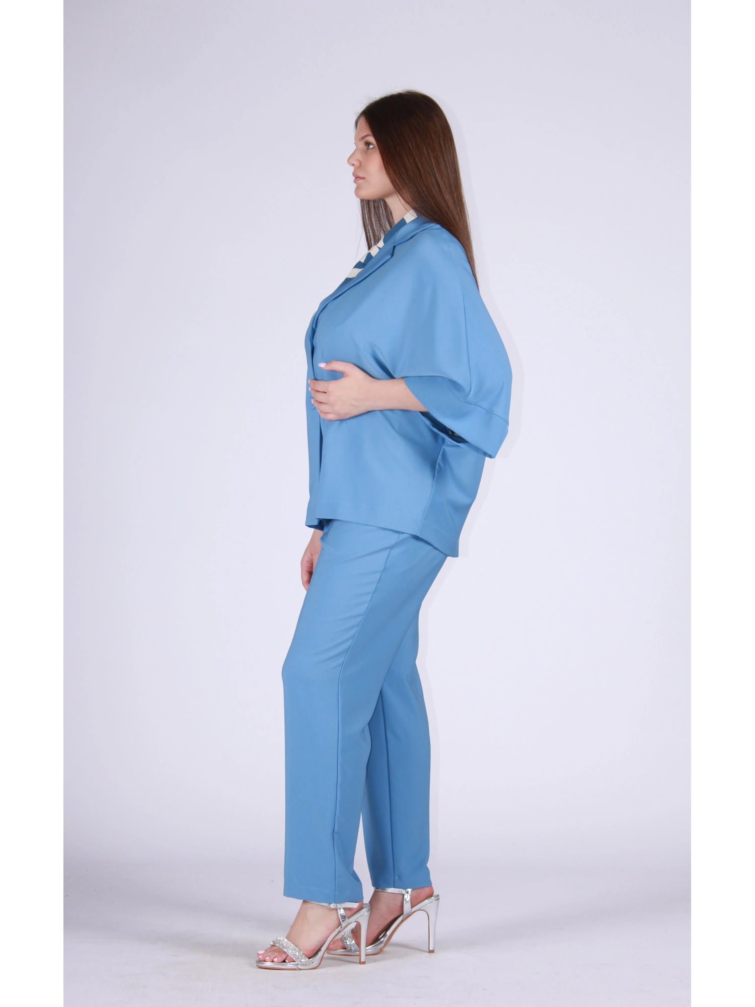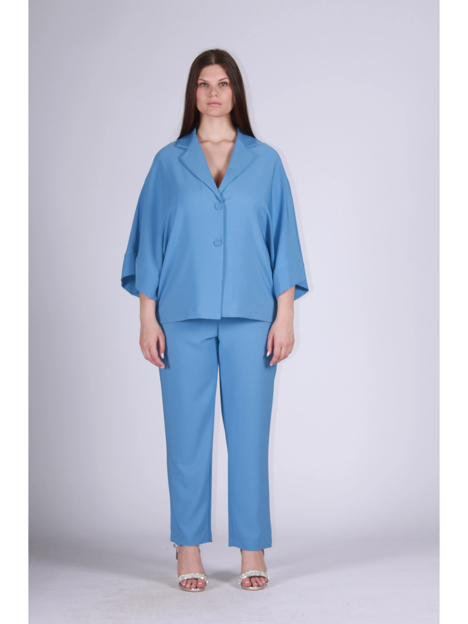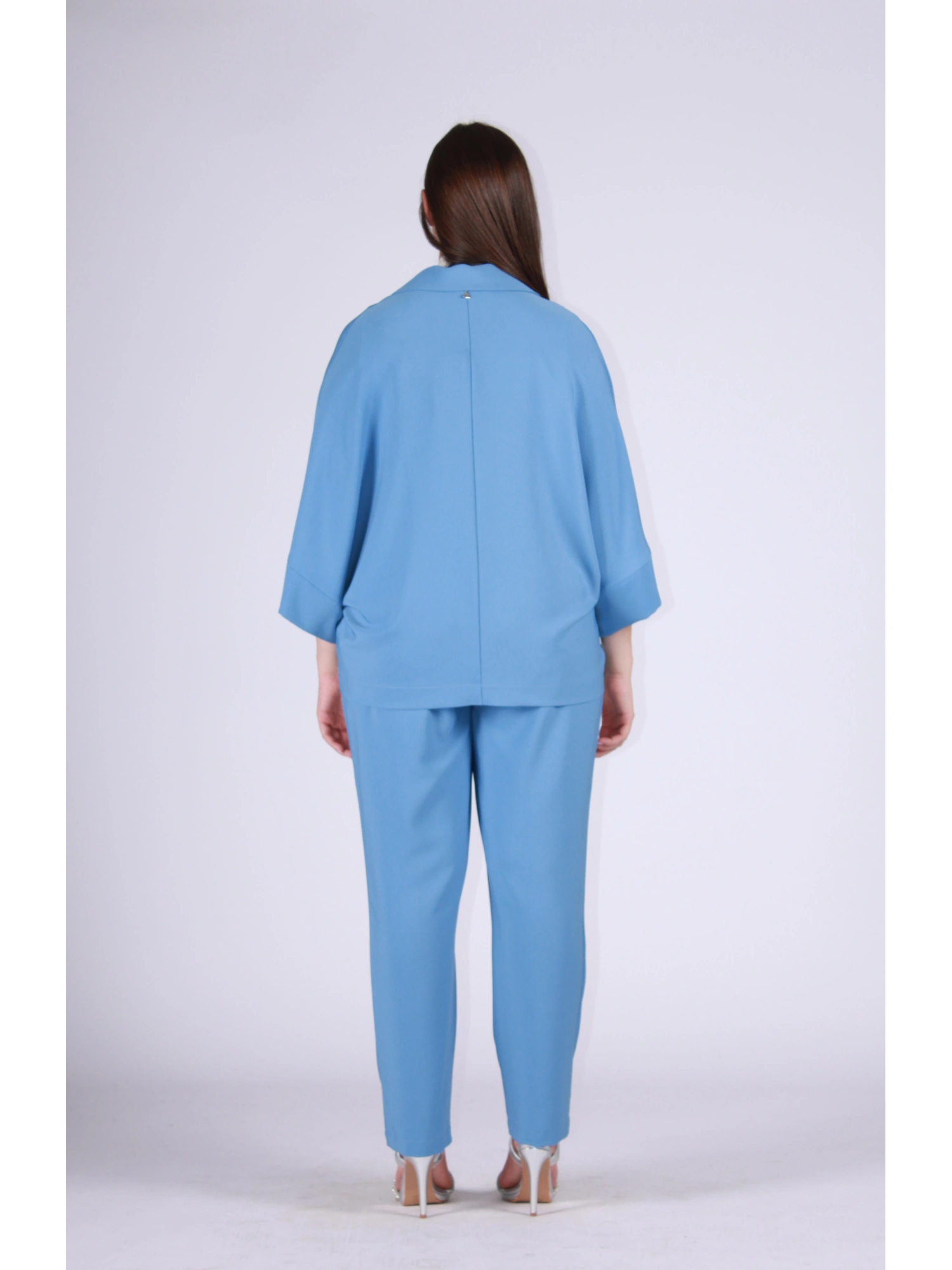 A KIMONO JACKET WITH A CONTEMPORARY AND REFINED DESIGN, CHARACTERIZED BY SOFT LINES AND FLUENT VOLUMES THAT LIGHTLY ENVELOP THE SILHOUETTE. A LAPEL COLLAR AND FRONT BUTTON CLOSURE FOR A TAILORED TOUCH, AND WIDE THREE-QUARTER SLEEVES THAT GIVE THE PIECE MOVEMENT AND MODERNITY. THE LOOSE FIT MAKES IT PERFECT FOR COORDINATED OUTFITS OR AS A LIGHT OUTERWEAR OVER BLOUSES AND TOPS, CREATING ELEGANT AND TRENDY LOOKS, IDEAL FOR BOTH DAYTIME AND MORE SOPHISTICATED OCCASIONS. THE MODEL IS 170 CM TALL AND WEARS A SIZE I.