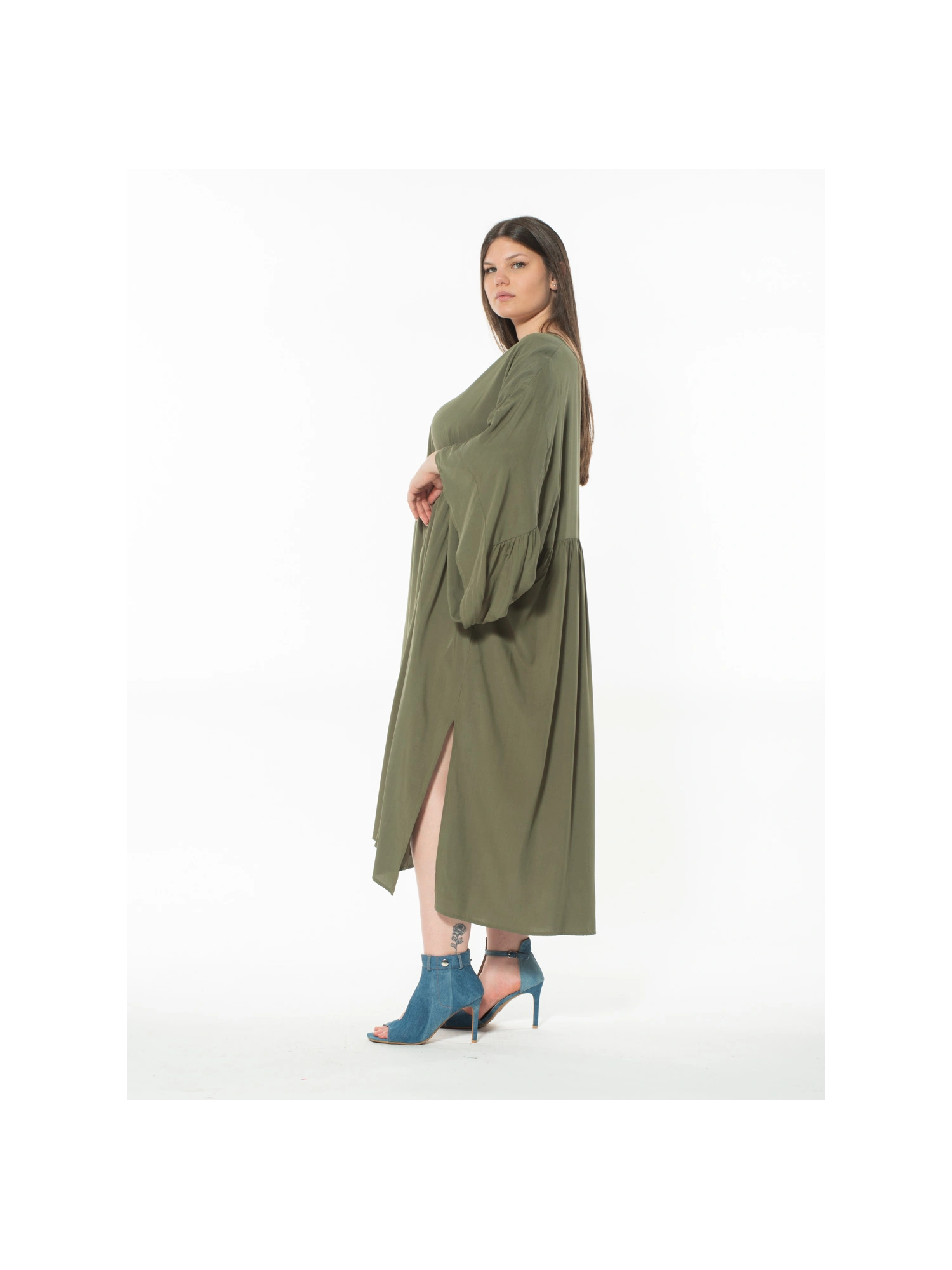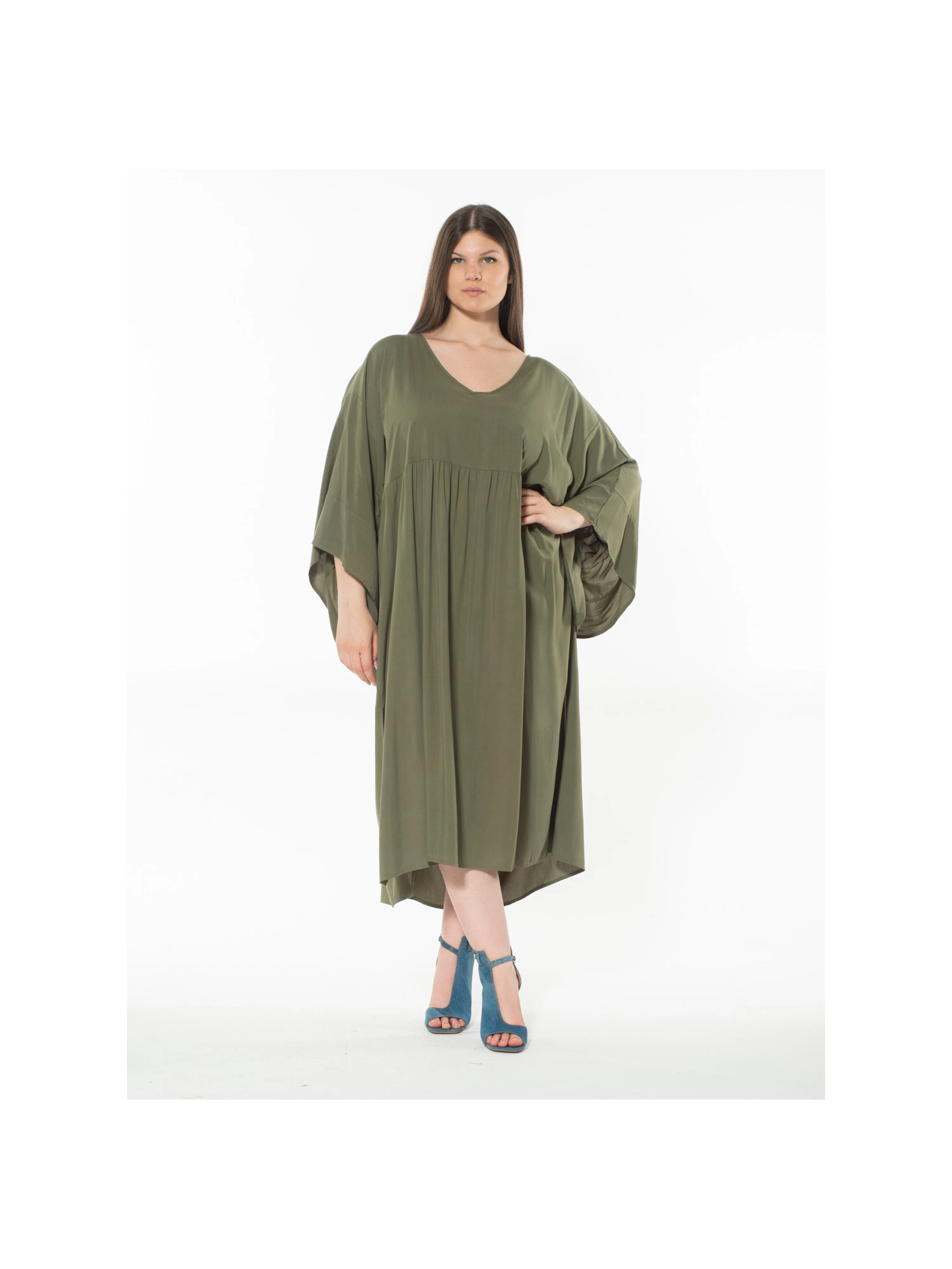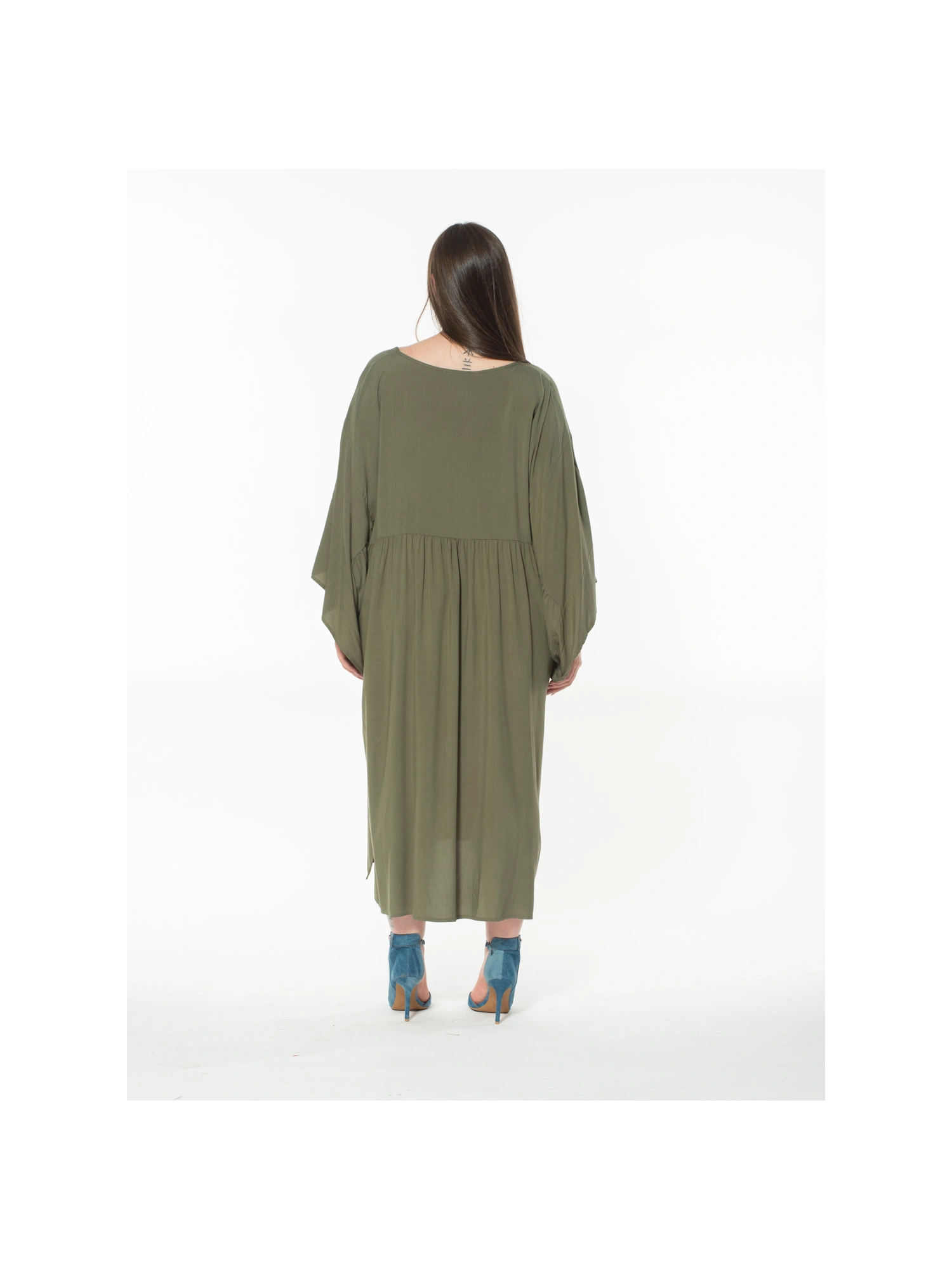 This elegant frappe dress is made of 100% viscose, offering a fluid and comfortable fit perfect for any spring/summer collection. The modern design features wide sleeves and a relaxed silhouette, accentuated by a delicate pleat under the bust that flatters the figure. The military green color adds a unique touch of sophistication. The model is 170 cm tall and wears a size II. A must-have for a contemporary wardrobe that adapts stylishly to both formal and informal occasions.