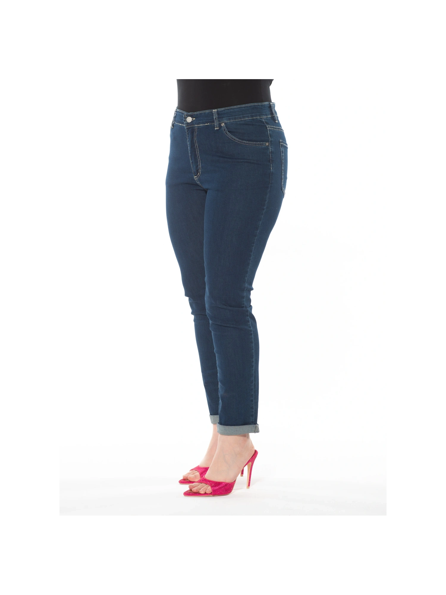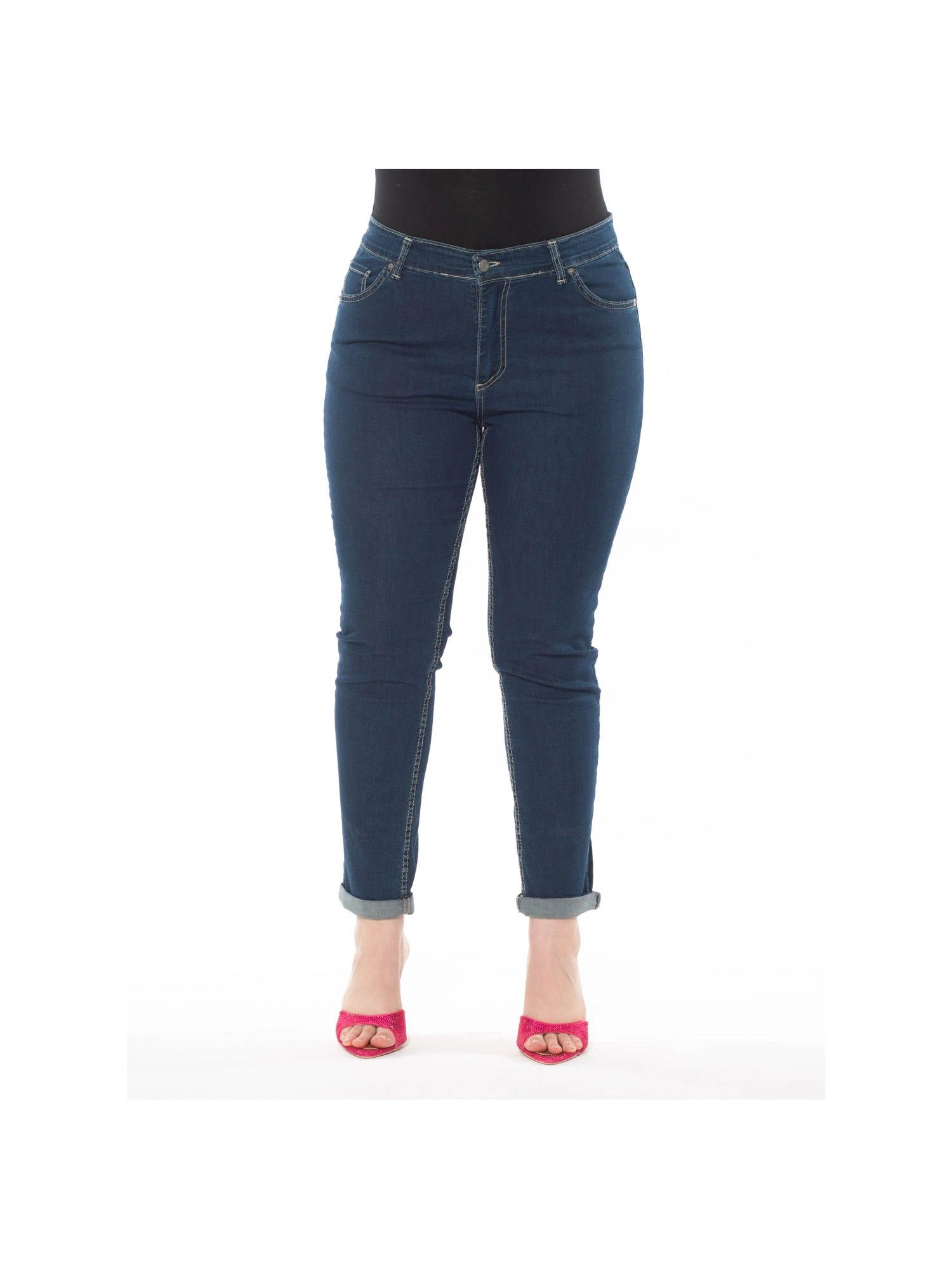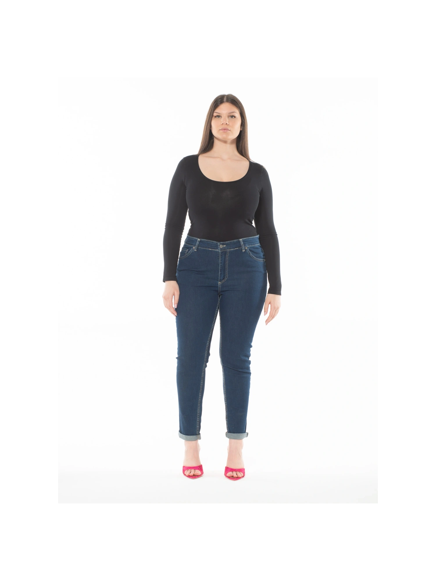 Jeans modello 5 tasche - Vita con passanti - Chiusura con bottone e cerniera ELASTICO VITA SUL RETRO- Logo ricamato sulla cintura posteriore - Gamba aderente - Lavaggio scuro - Colore unico - Composizione 98%CO 2%EA - La modella è alta 170 cm e indossa la taglia 48
