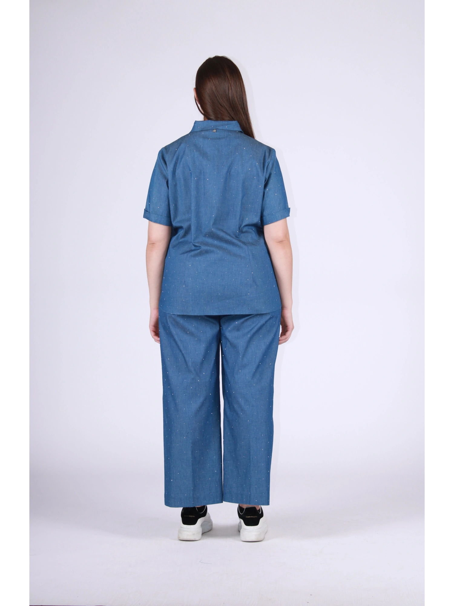 A DENIM SHIRT WITH A CONTEMPORARY STYLE, ENRICHED WITH MICRO GLASSES THAT BRING LIGHT AND PERSONALITY TO THE LOOK. THE CLEAN LINE AND LOOSE FIT CREATE A CAREFUL ELEGANCE, PERFECT FOR WEARING EITHER SINGLE OR WITH A COORDINATED OUTFIT. A PIECE THAT COMBINES COMFORT AND STYLE, DESIGNED TO NATURALLY FLAW THE FIGURE. THE MODEL IS 170 CM TALL AND WEARS A SIZE M.