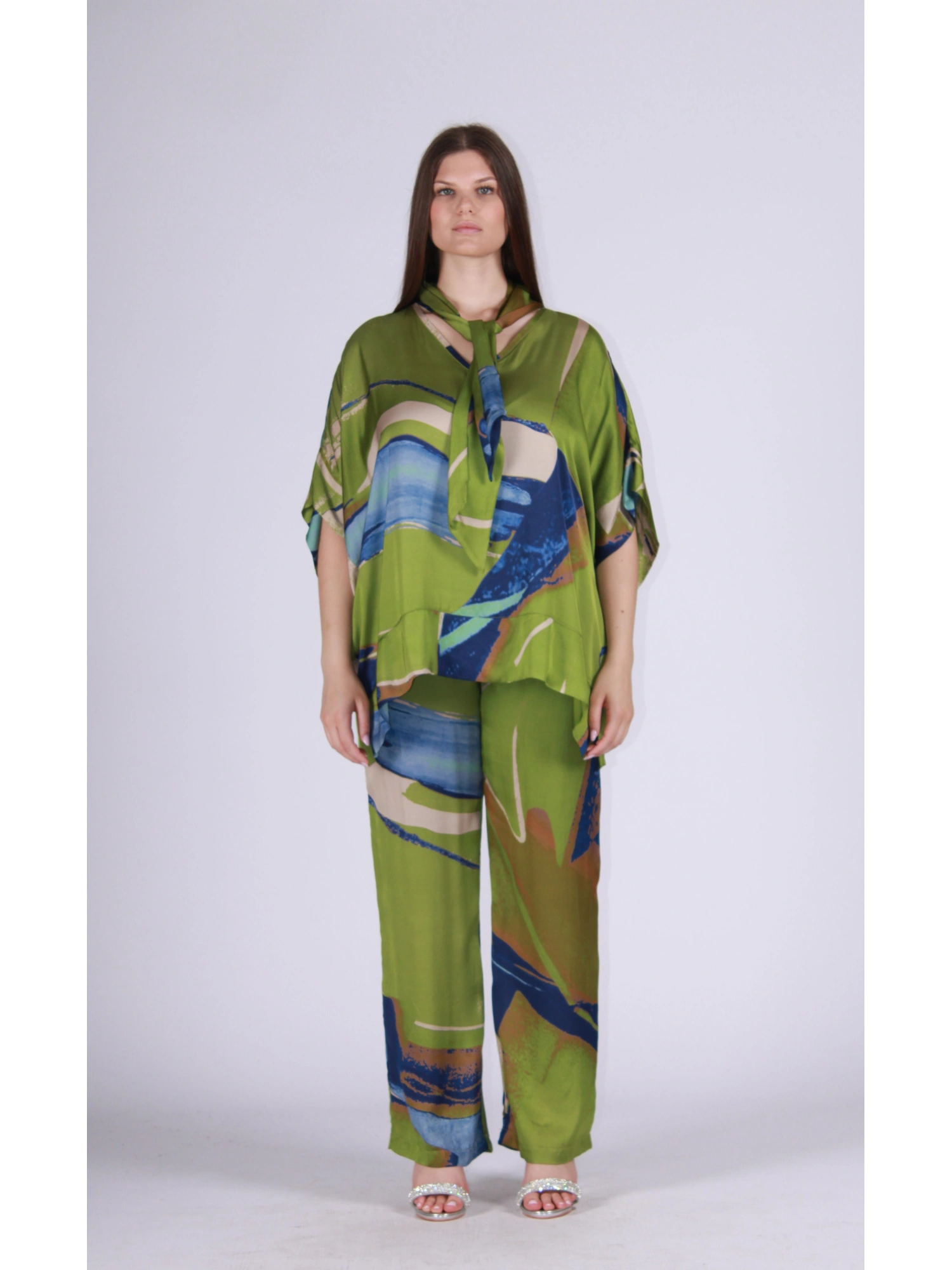 LIGHTWEIGHT AND FLOWING 100% VISCOSE PONCHO TUNIC, DESIGNED TO FLAW THE FIGURE WITH A LOOSE, EASY FIT. A SOFT LINE WITH DROPPED SHOULDERS AND KIMONO SLEEVES ENSURE COMFORT AND FREEDOM OF MOVEMENT. A V-NECK WITH A BUILT-IN SCARF ADDING A SOPHISTICATED, FEMININE DETAIL, IDEAL FOR CREATING COORDINATED, IMPACTFUL LOOKS. THE ASYMMETRICAL HEM GIVES DYNAMIC EFFECT TO THE SILHOUETTE AND SOFTLY COVERS THE HIPS. PERFECT WITH THE MATCHING TROUSERS FOR A CONTEMPORARY, TRENDY OUTFIT, SUITABLE FOR BOTH DAYWEAR AND FREE TIME. THE MODEL IS 170 CM TALL AND WEARS A SIZE I.