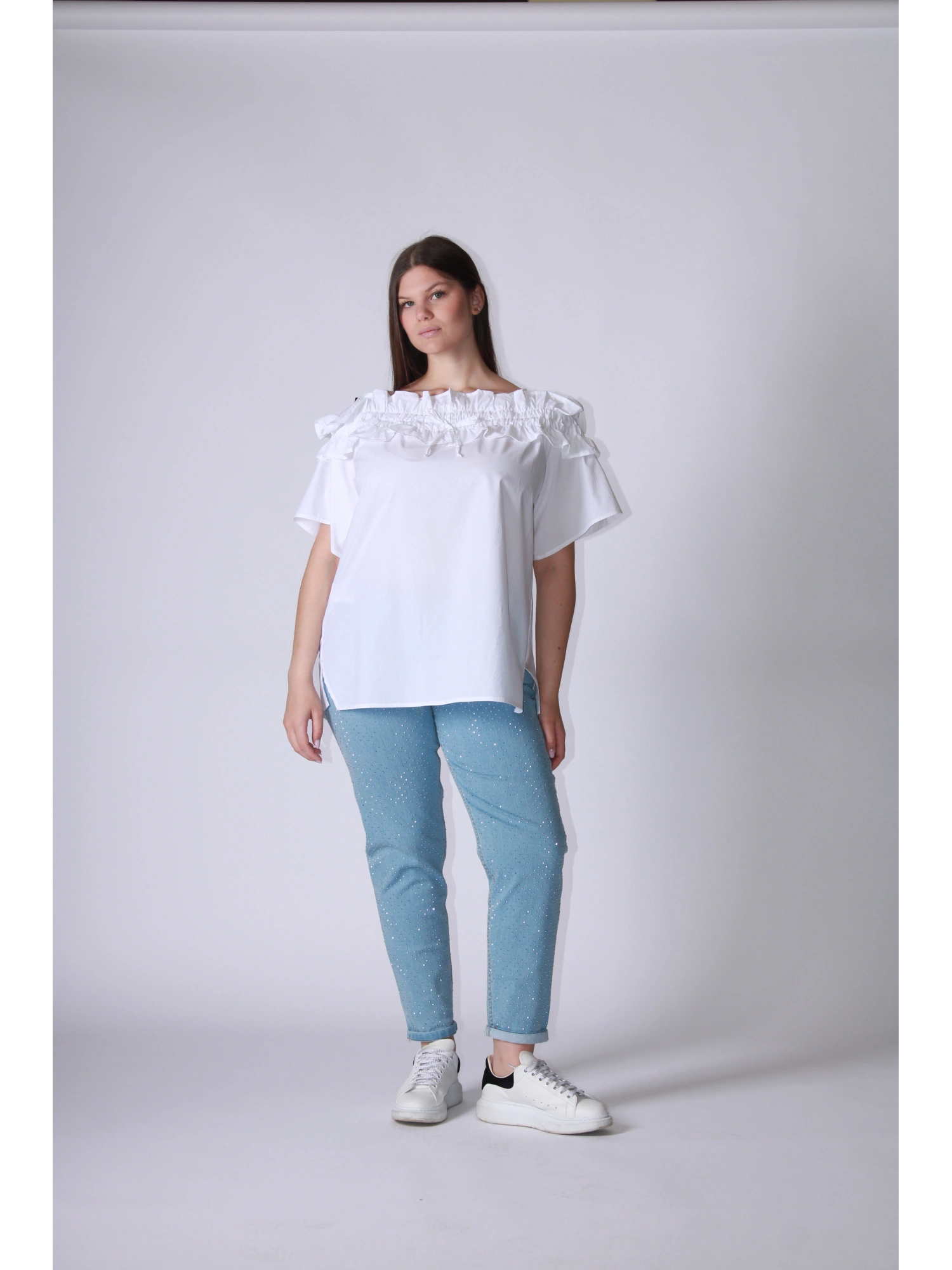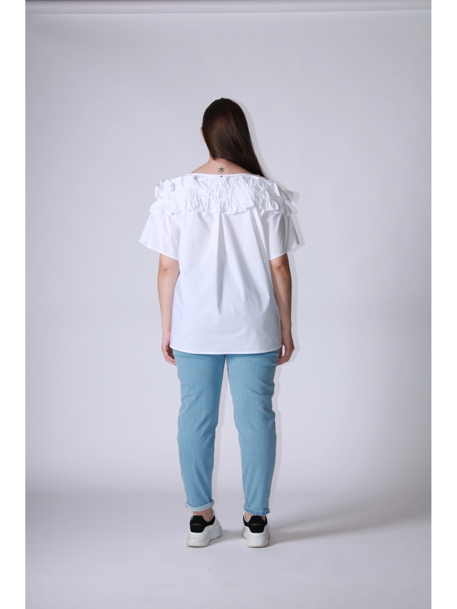 A PURE COTTON BLUSH WITH A ROMANTIC AND REFINED FLAVOR, CHARACTERIZED BY AN ELEGANT PLAY OF RUFFLES ON THE NECKLINE THAT DELICATELY FRAMES THE FACE. THE SOFT LINE FIT THE FIGURE NATURALLY, ENSURING COMFORT AND FEMININITY, WHILE THE WIDE SLEEVES GIVE LIGHTNESS AND MOVEMENT. A GARMENT DESIGNED TO ENHANCE EVERY LOOK WITH A SWEET YET DECORATIVE STYLE, PERFECT FOR THOSE WHO LOVE REFINED DETAILS. THE MODEL IS 170 CM TALL AND WEARS A SIZE I.