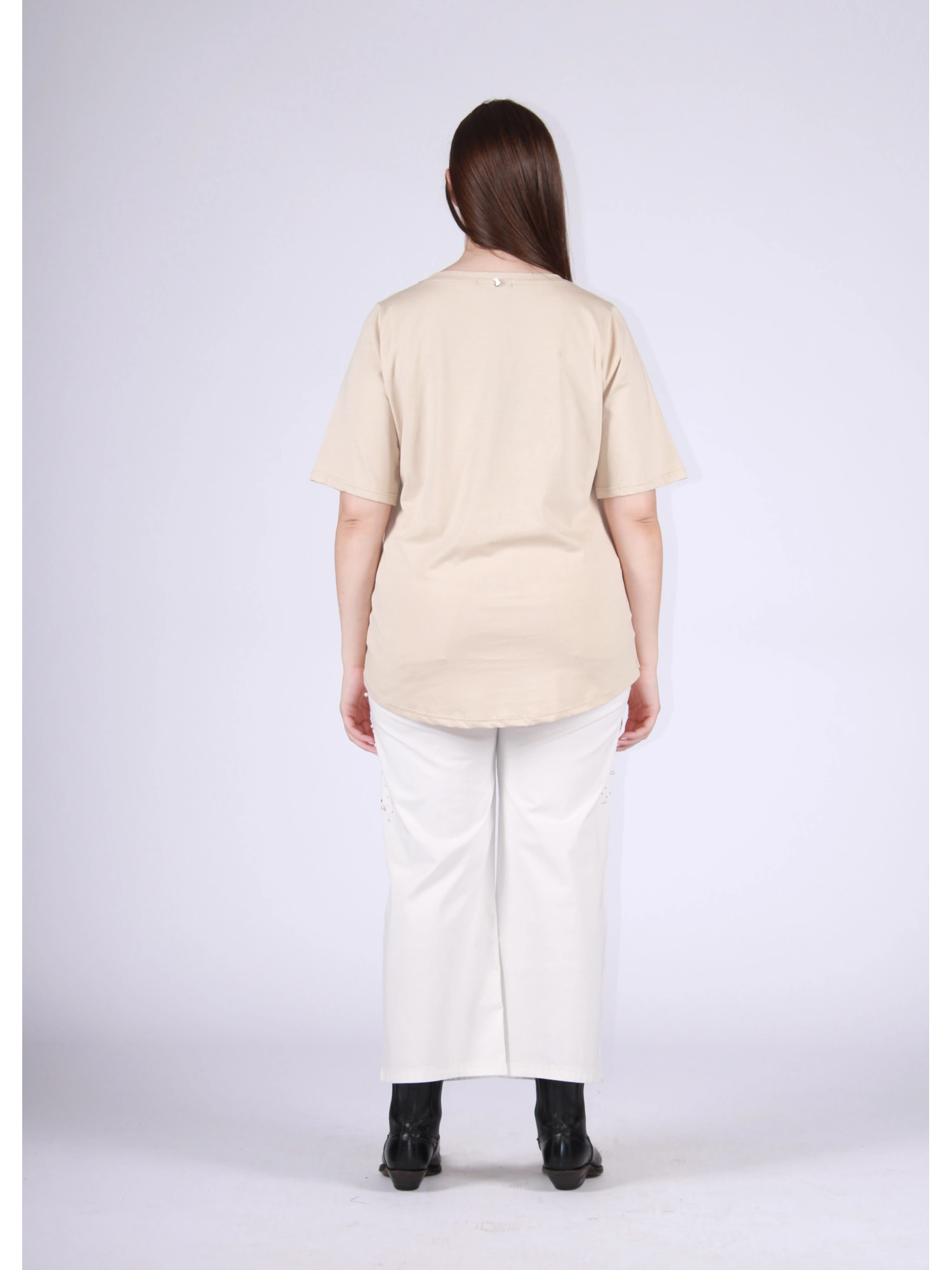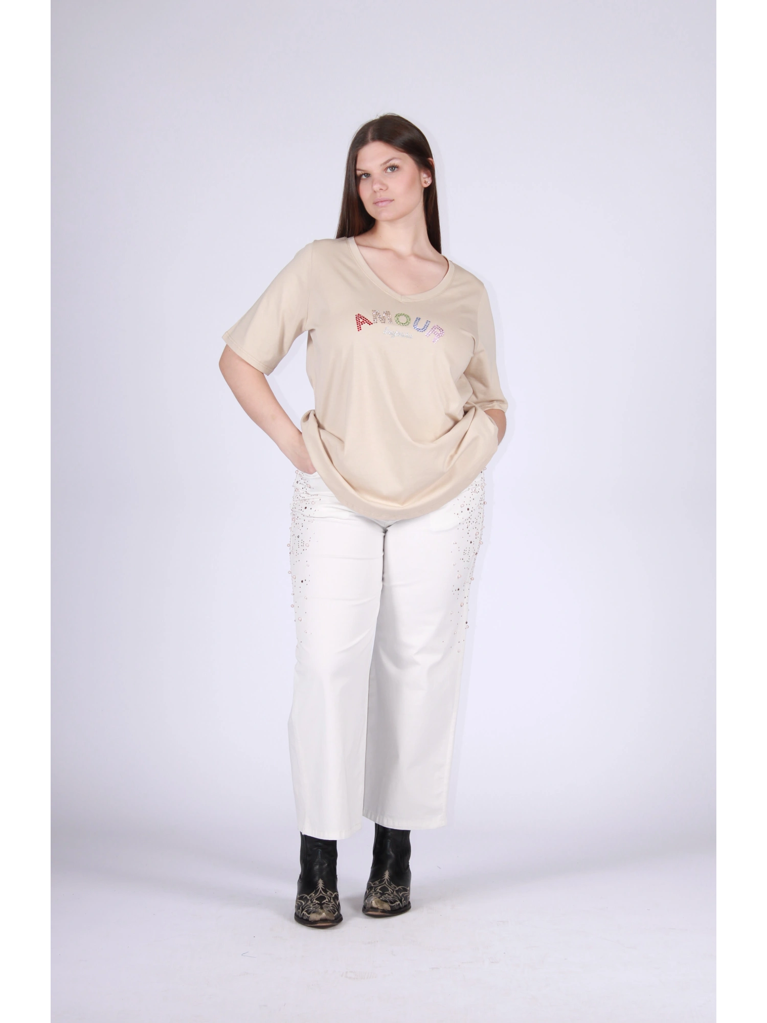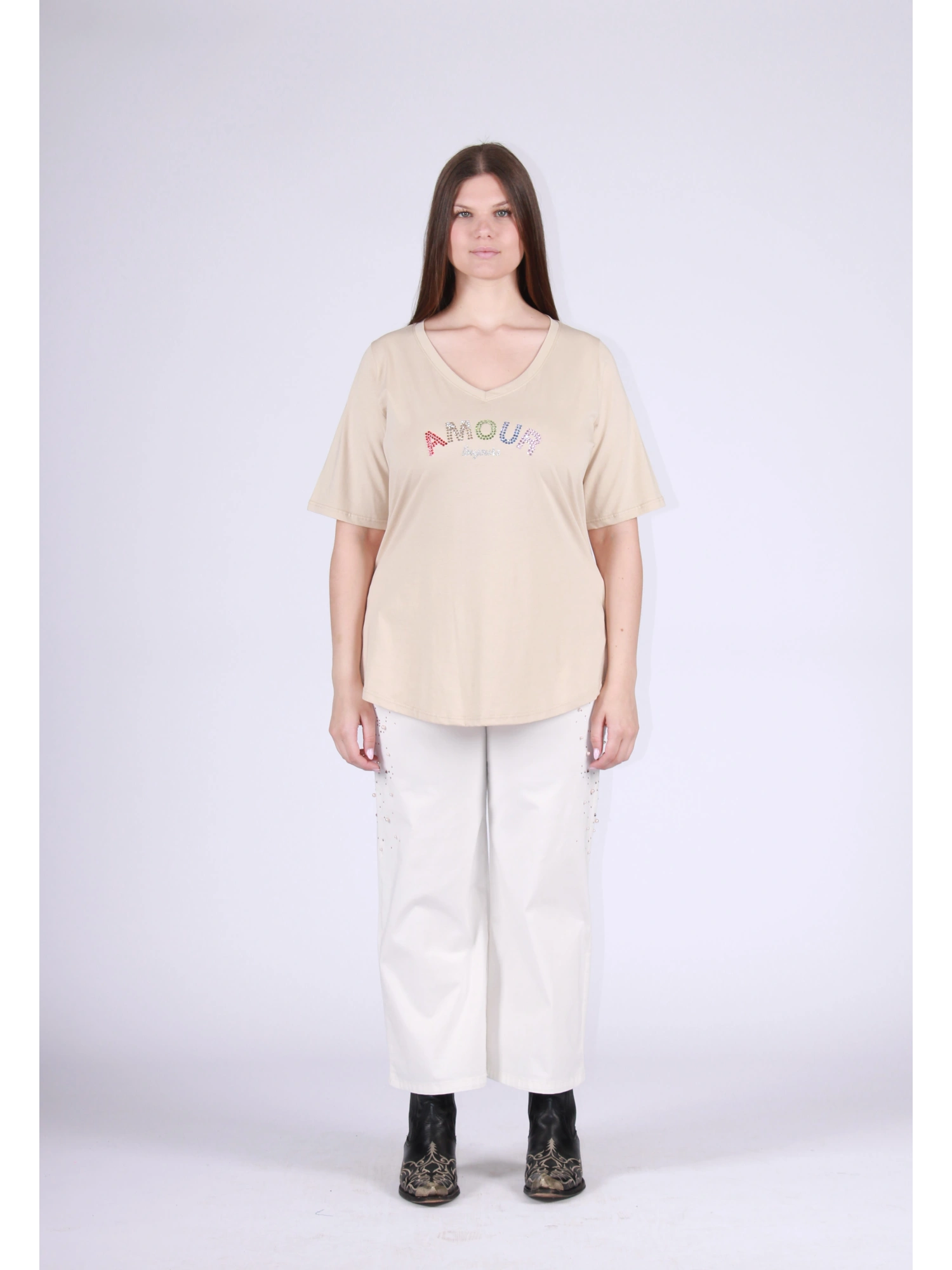 PURE COTTON T-SHIRT WITH A FEMININE AND CONTEMPORARY STYLE, ENRICHED BY A DECORATIVE WRITING THAT CONVEYS A POSITIVE AND REFINED MESSAGE. THE V-NECK ELEGANTLY ENHANCES THE NECK LINE, WHILE THE SOFT FIT FITS THE BODY NATURALLY AND COMFORTLY. THE PURE COTTON FABRIC ENSURES BREATHABILITY AND A PLEASANT COMFORT ON THE SKIN, IDEAL FOR EVERYDAY USE. A VERSATILE AND EASY-TO-COMBINE PIECE, PERFECT FOR CREATING CASUAL LOOKS WITH A MODERN AND FEMININE TASTE. THE MODEL IS 170 CM TALL AND WEARS A SIZE M.