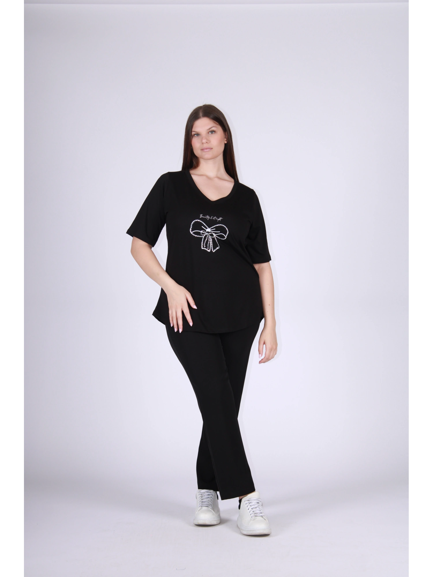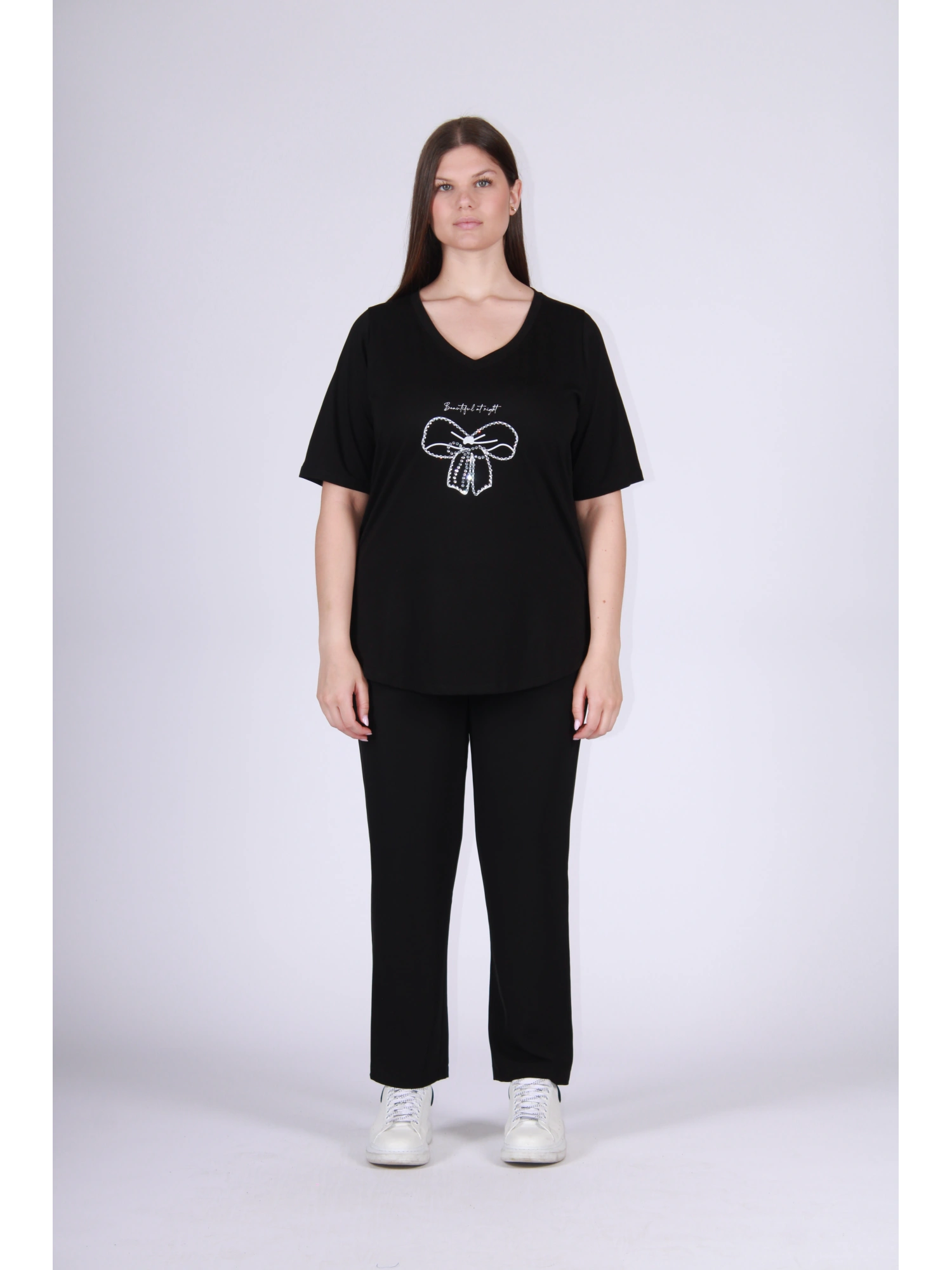 COTTON T-SHIRT WITH A RHINESTONE BOW DECORATION, DESIGNED TO COMBINE COMFORT AND FEMININITY IN AN EASY-TO-WEAR GARMENT. THE SOFT LINE NATURALLY ACCORDS TO THE SHAPE, ENSURING A COMFORTABLE AND FLUENT FIT. THE V-NECK ELEGANTLY ENHANCES THE DÉCOLLETÉ, WHILE THE DECORATIVE BOW PATTERN GIVES A BRIGHT AND REFINED TOUCH. THE COTTON FABRIC ENSURES BREATHABILITY AND A PLEASANT COMFORT ON THE SKIN, MAKING THE GARMENT IDEAL FOR EVERYDAY USE BUT ALSO FOR MORE REFINED LOOKS. A T-SHIRT THAT TRANSFORMS AN ESSENTIAL INTO A DETAIL OF STYLE. THE MODEL IS 170 CM TALL AND WEARS A SIZE M.