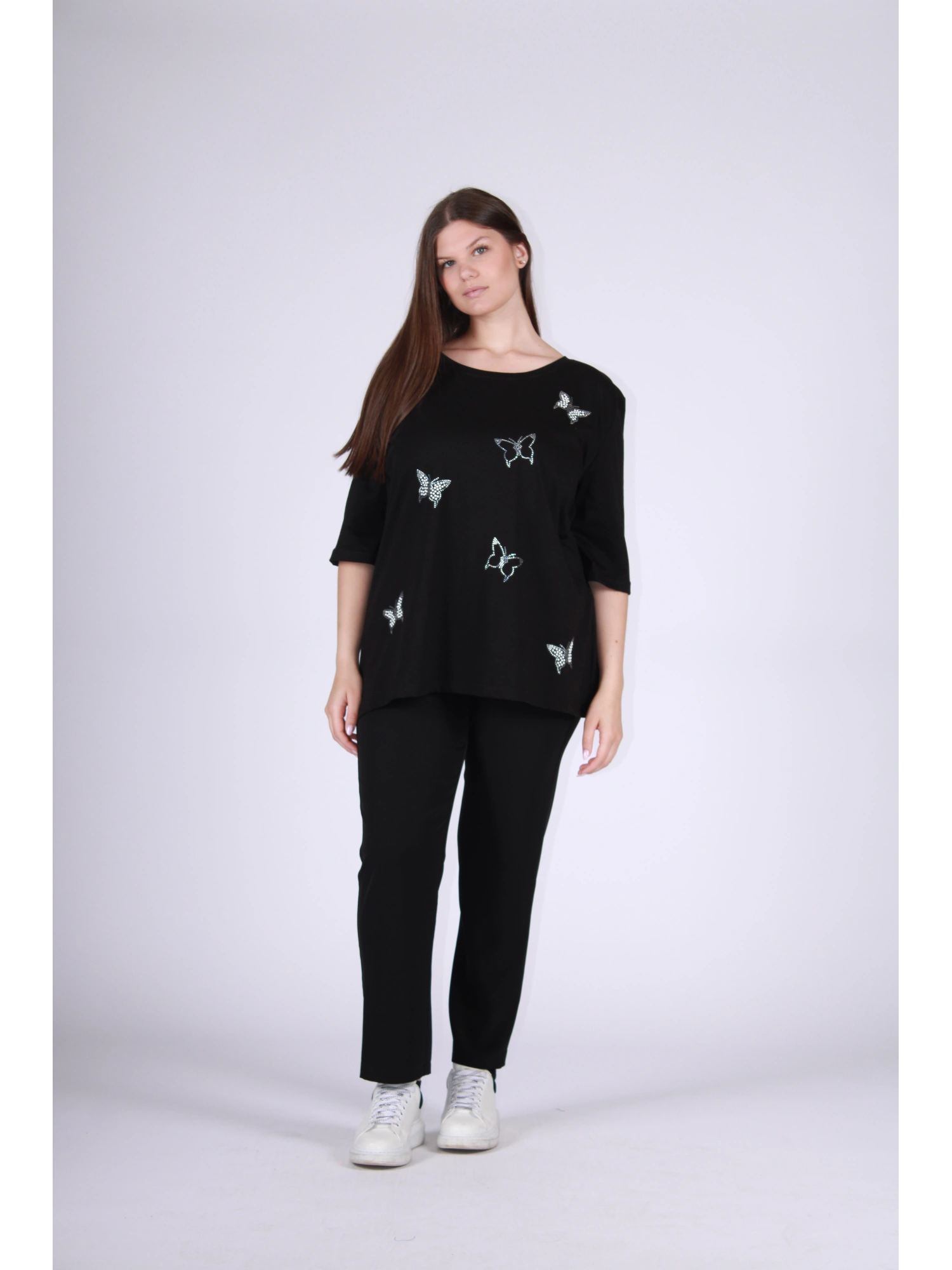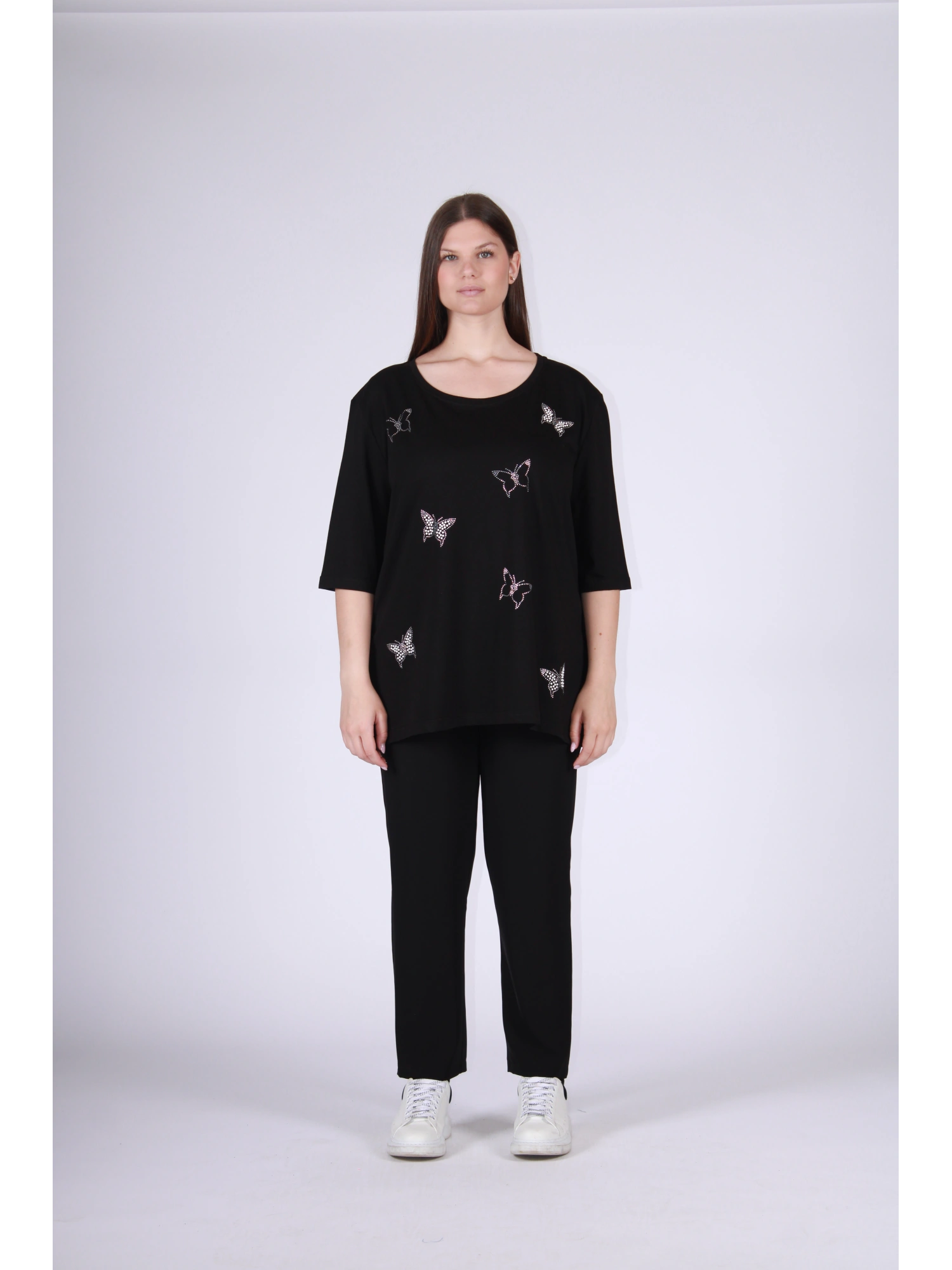 SOFT, FLOWING COTTON T-SHIRT WITH A LOOSE, FEMININE FIT DESIGNED TO NATURALLY FIT THE BODY. THE RHINESTONE BUTTERFLY APPLIQUÉS, LIGHTLY DISTRIBUTED ON THE FRONT, GIVE A LIGHTNESS AND DISCREET ELEGANCE, CONVEYING AN IDEA OF MOVEMENT, FREEDOM, AND REFINED SIMPLICITY. A VERSATILE PIECE WITH STRONG B2B APPEAL, PERFECT FOR ENRICHING THE OFFERING WITH A ROMANTIC AND CONTEMPORARY THEME, EASY TO PLAY AND WEAR. THE MODEL IS 170 CM TALL AND WEARS A SIZE I.