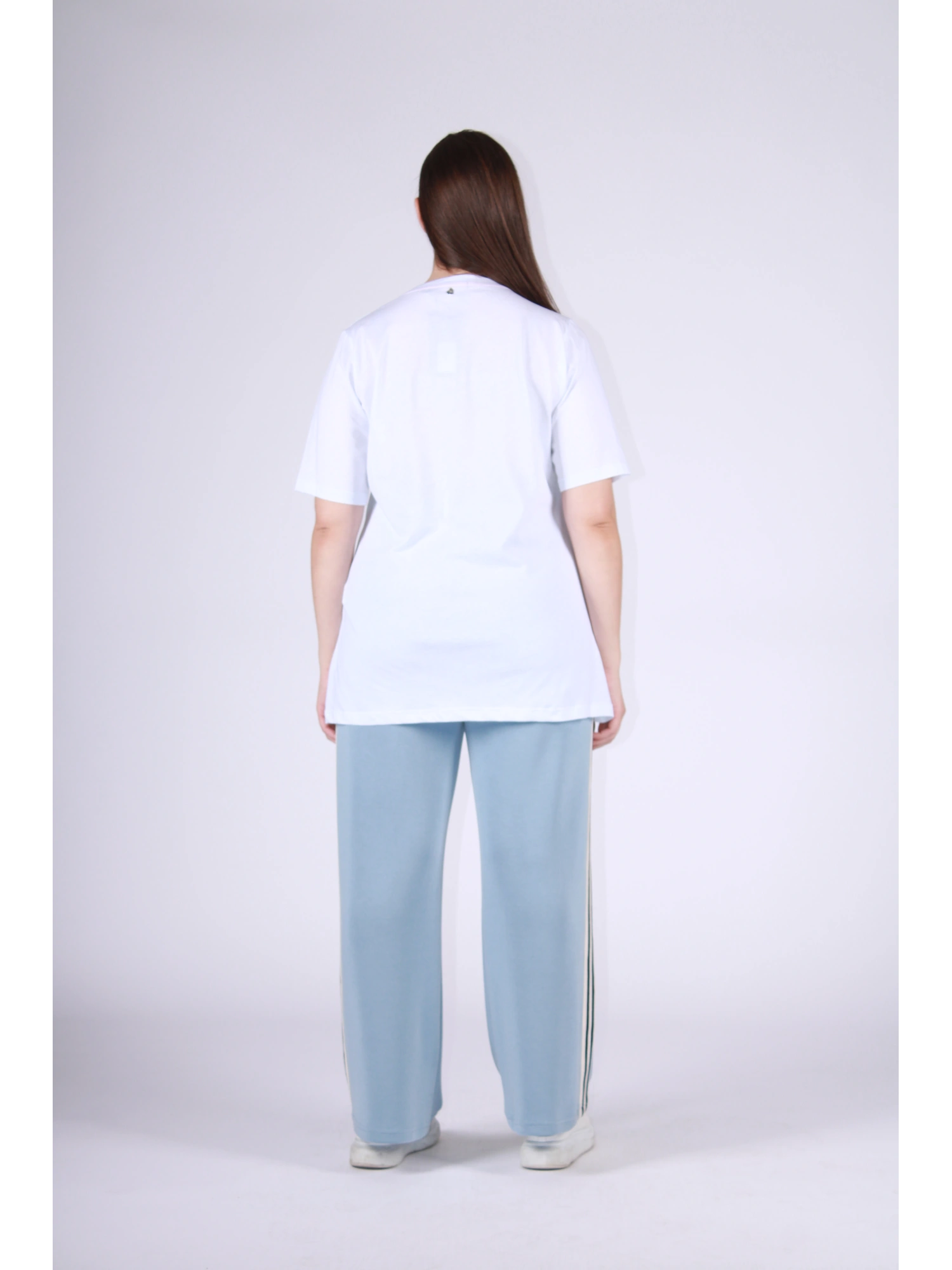 A T-SHIRT WITH A GRAPHIC AND CONTEMPORARY STYLE, ENRICHED BY A DECORATIVE PRINT THAT CREATES A REFINED AND CHARACTERISTIC VISUAL PLAY. THE SOFT LINE WRAPPES THE WEAR NATURALLY, OFFERING COMFORT AND A FLUENT FIT THAT ENHANCES THE SILHOUETTE. AN EASY-TO-WEAR PIECE BUT RICH IN PERSONALITY, PERFECT FOR CONSTRUCTING MODERN AND FASHIONABLE LOOKS WITH AN ICONIC TOUCH. THE MODEL IS 170 CM TALL AND WEARS A SIZE M.