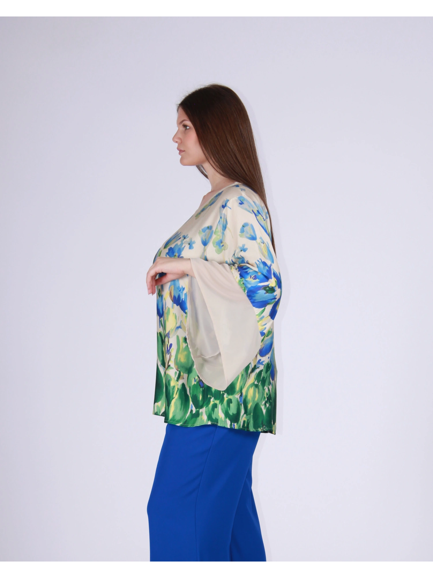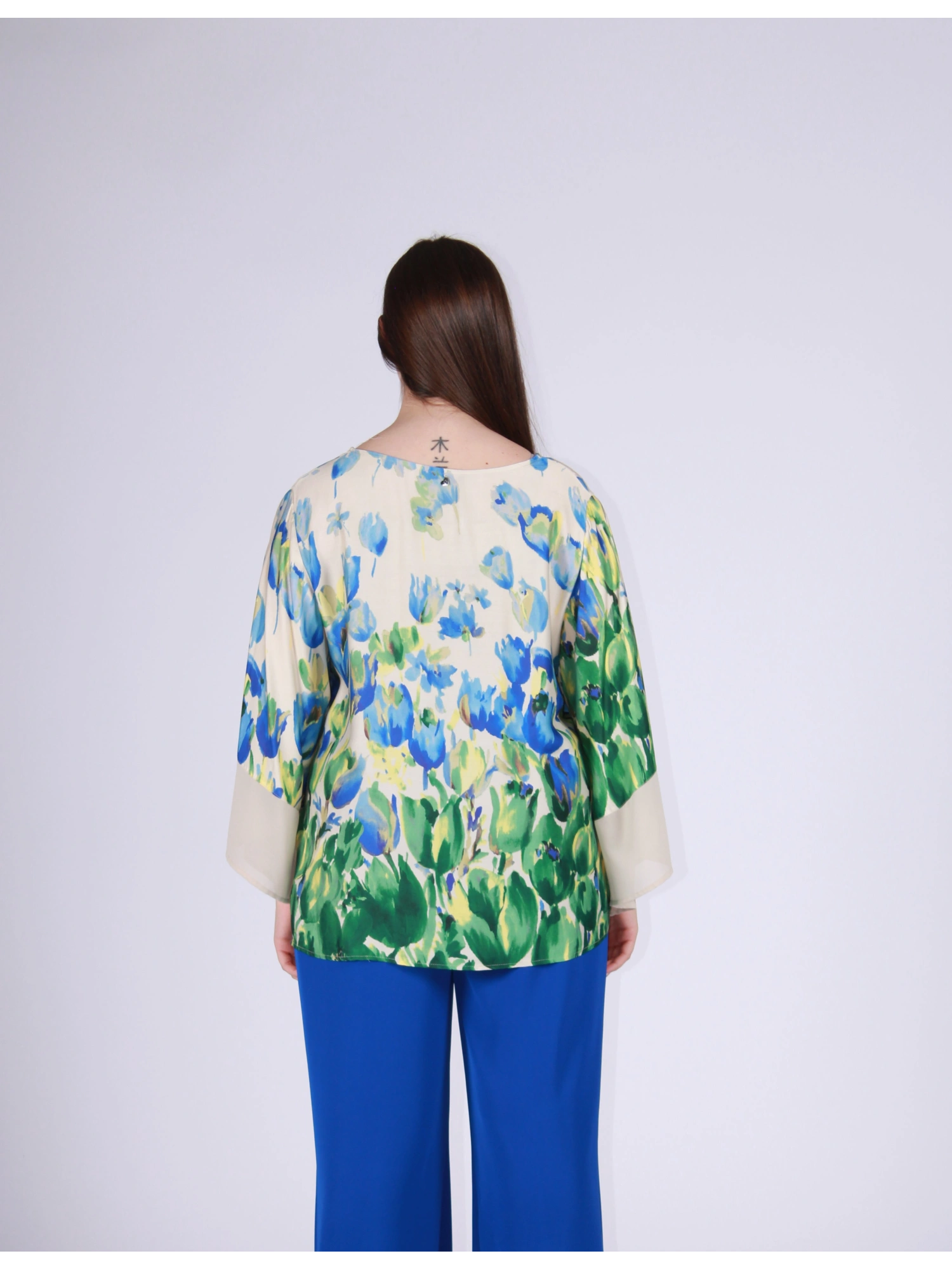A SOFT, FLOWING HANDKERCHIEF-STYLE TUNIC WITH A LOOSE FIT AND A LIGHT FALL THAT CARESSES THE SHAPE WITHOUT MARKING IT. A ESSENTIAL ROUND NECKLINE AND WIDE SLEEVES WITH FLARED HEM THAT GIVE MOVEMENT AND REFINEMENT TO THE LOOK. A STRONG, ARTISTIC FLORAL PRINT, PERFECT FOR LIGHTING UP YOUR OUTFIT WITH A FEMININE, CONTEMPORARY TOUCH. IDEAL FOR PAIRING WITH LINEAR OR PALAZZO TROUSERS FOR A CAFETERIA YET SOPHISTICATED ELEGANCE. THE MODEL IS 170 CM TALL AND WEARS A SIZE M.
