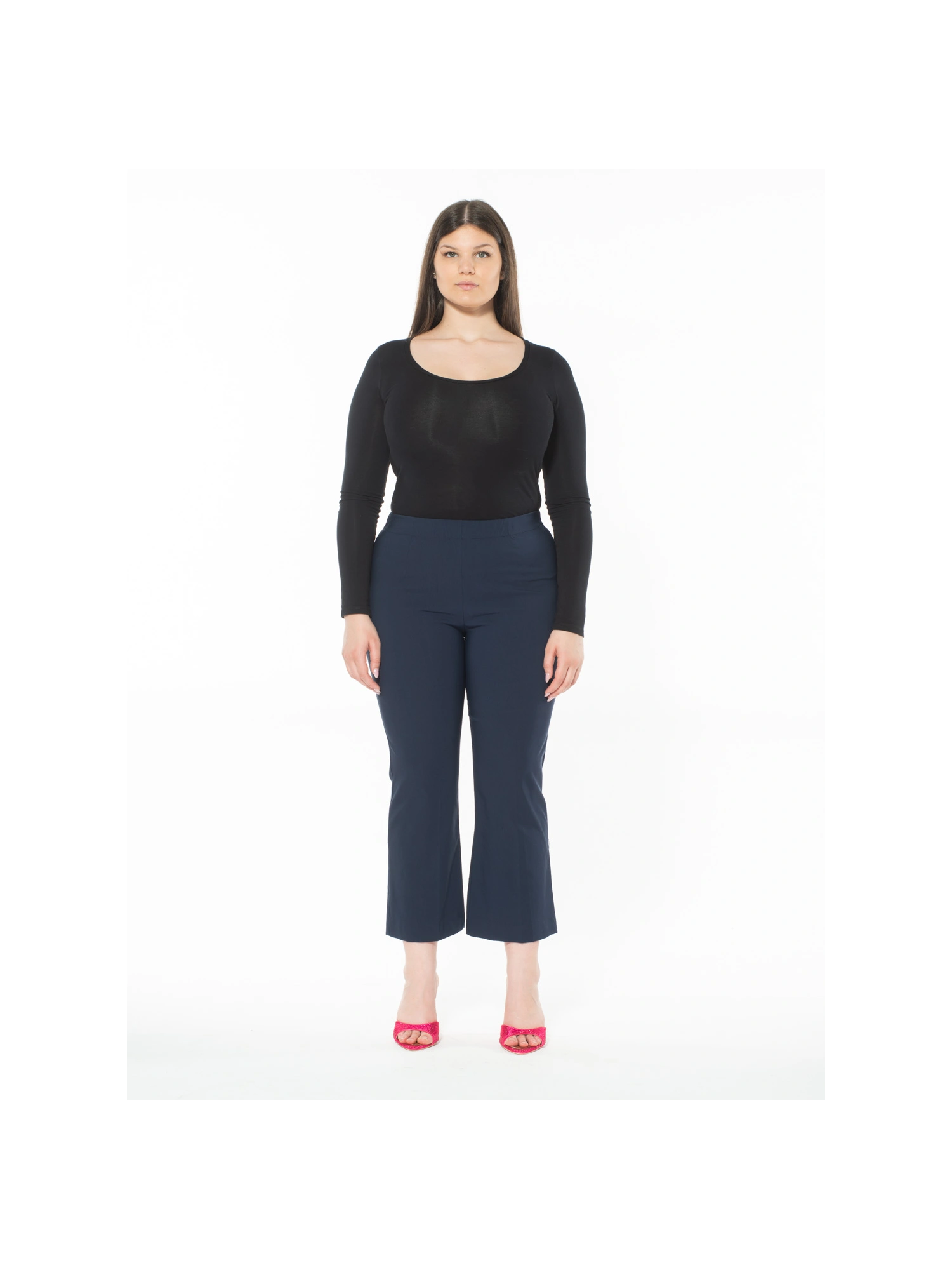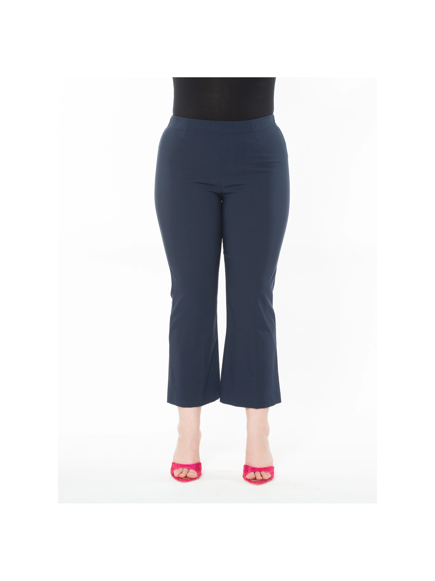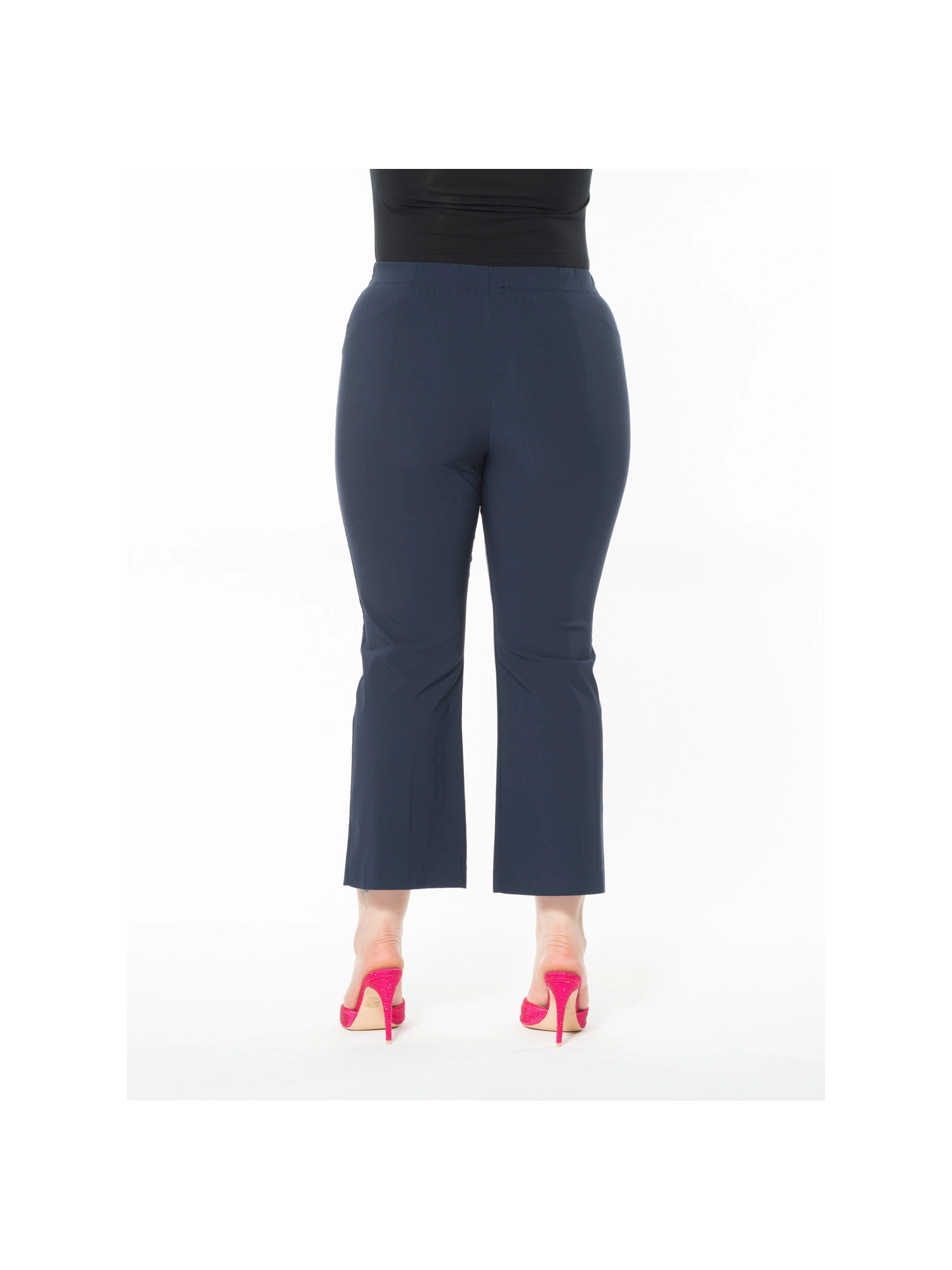 I pantaloni tronchetto in bengalina di viscosa elasticizzata combinano eleganza e comfort. La loro vestibilità è resa perfetta dalla vita elasticizzata e dal taglio che si allarga leggermente alle caviglie, offrendo un look moderno e raffinato. Disponibili in vari colori, questi pantaloni sono versatili per ogni stagione e occasione. La modella è alta 170 cm e indossa una taglia I.