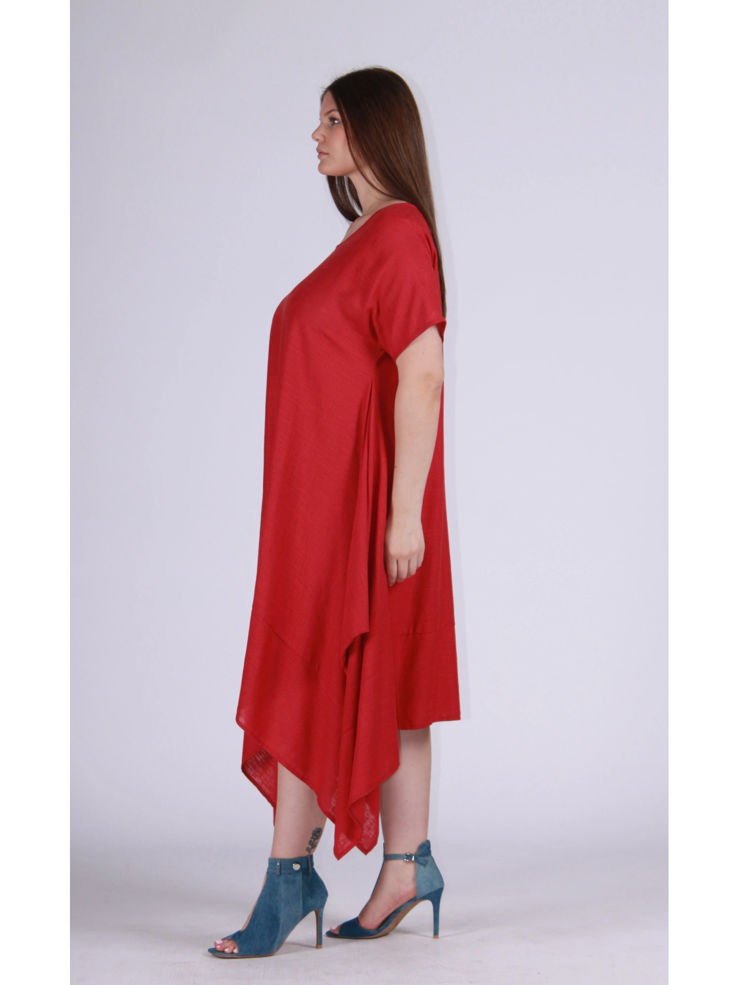 LA LINEA AMPIA E SCIVOLATA ACCAREZZA LE FORME CON LEGGEREZZA, MENTRE IL FONDO ASIMMETRICO A PUNTE CREA MOVIMENTO E DINAMISMO, DONANDO AL LOOK UN CARATTERE DECISO E RAFFINATO. LO SCOLLO TONDO E LA MANICA CORTA COMPLETANO IL CAPO CON UN TOCCO ESSENZIALE E VERSATILE.