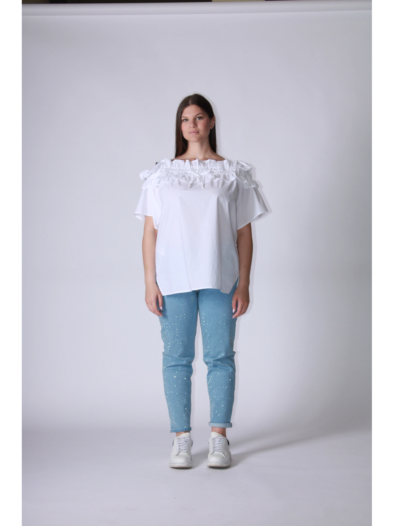 BLUSAIN PURO COTONE DAL GUSTO ROMANTICO E RAFFINATO, CARATTERIZZATA DA UN ELEGANTE GIOCO DI ROUCHES SULLO SCOLLO CHE INCORNICIA IL VISO CON DELICATEZZA. LA LINEA MORBIDA ACCOMPAGNA LA FIGURA CON NATURALEZZA, GARANTENDO COMFORT E FEMMINILITÀ, MENTRE LE MANICHE AMPIE DONANO LEGGEREZZA E MOVIMENTO. UN CAPO PENSATO PER VALORIZZARE OGNI LOOK CON UNO STILE DOLCE MA DECISO, PERFETTO PER CHI AMA I DETTAGLI RICERCATI.