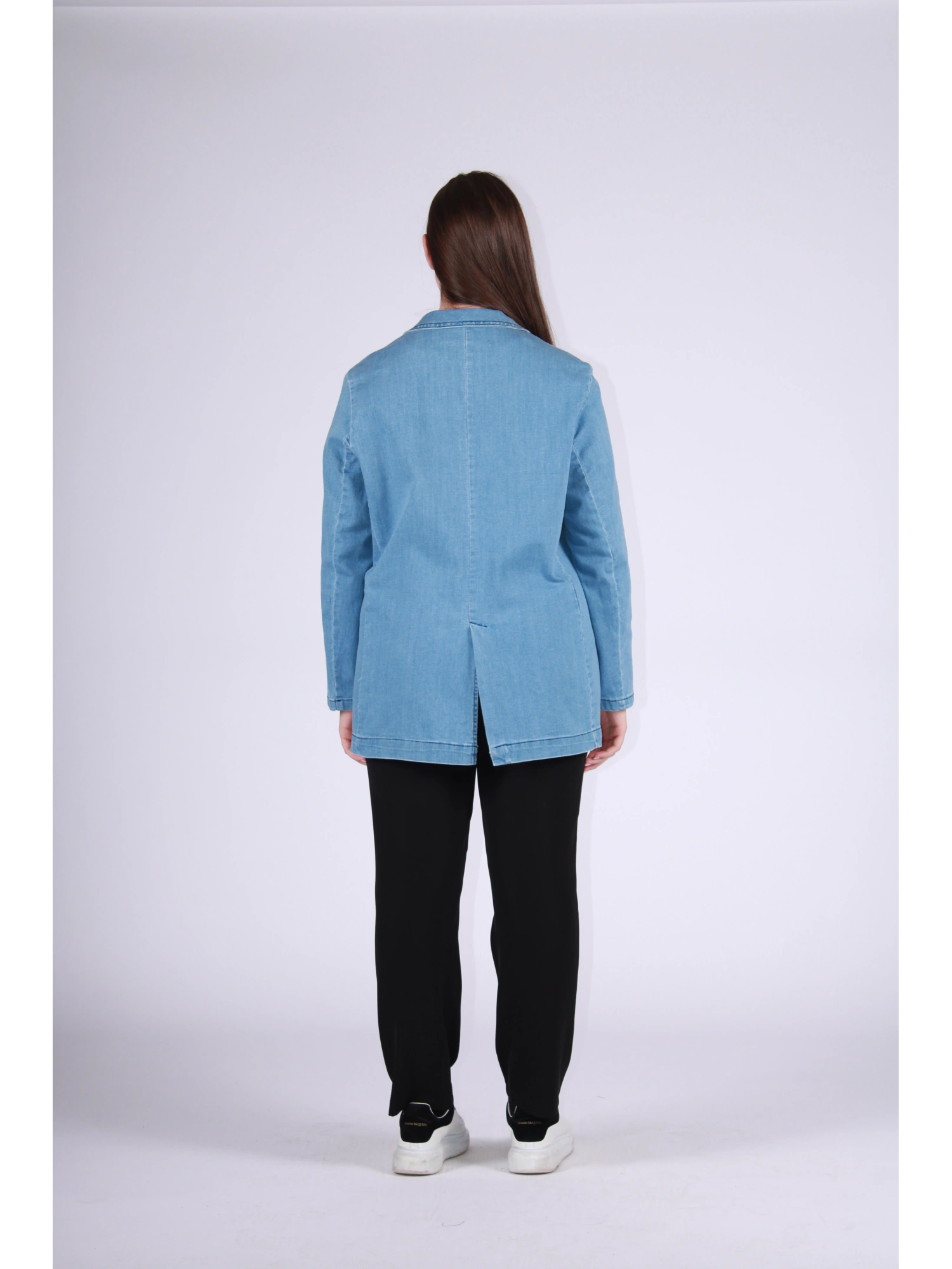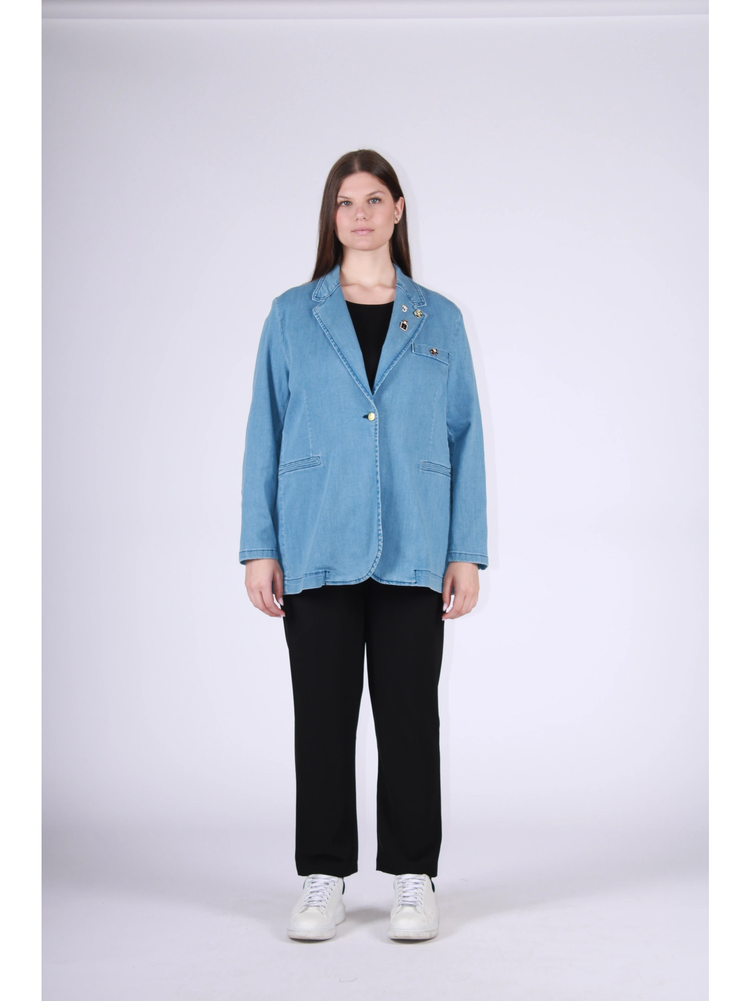 GIACCA IN JEANS DAL TAGLIO MORBIDO E CONTEMPORANEO, PENSATA PER UN’ELEGANZA DISINVOLTA E FACILE DA INDOSSARE OGNI GIORNO. LA LINEA PULITA CON REVER CLASSICO SI ARRICCHISCE DI SPILLE DECORATIVE CHE DONANO PERSONALITÀ E UN TOCCO DISTINTIVO AL CAPO. COMODA E VERSATILE, È IDEALE PER COMPLETARE LOOK CASUAL O PIÙ RICERCATI, AGGIUNGENDO CARATTERE SENZA RINUNCIARE AL COMFORT.