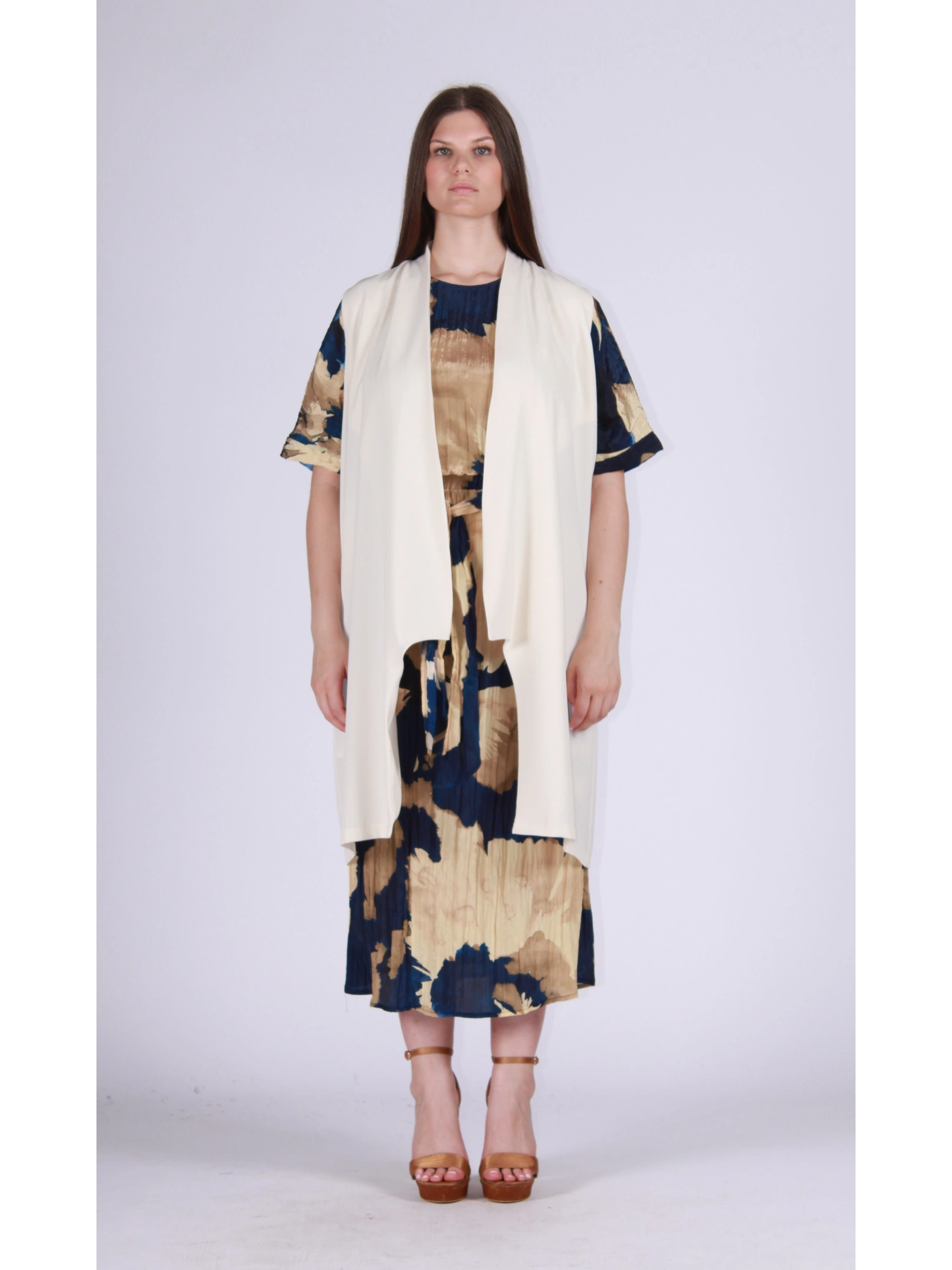 MODELLO SENZA MANICHE CON LINEA FLUIDA E APERTURA FRONTALE, CARATTERIZZATO DA VOLUMI AMPI CHE SCIVOLANO SULLE FORME VALORIZZANDO LA SILHOUETTE. LA LUNGHEZZA ALLUNGATA E IL DESIGN ESSENZIALE LO RENDONO IDEALE PER SOVRAPPOSIZIONI E OUTFIT STRATIFICATI.