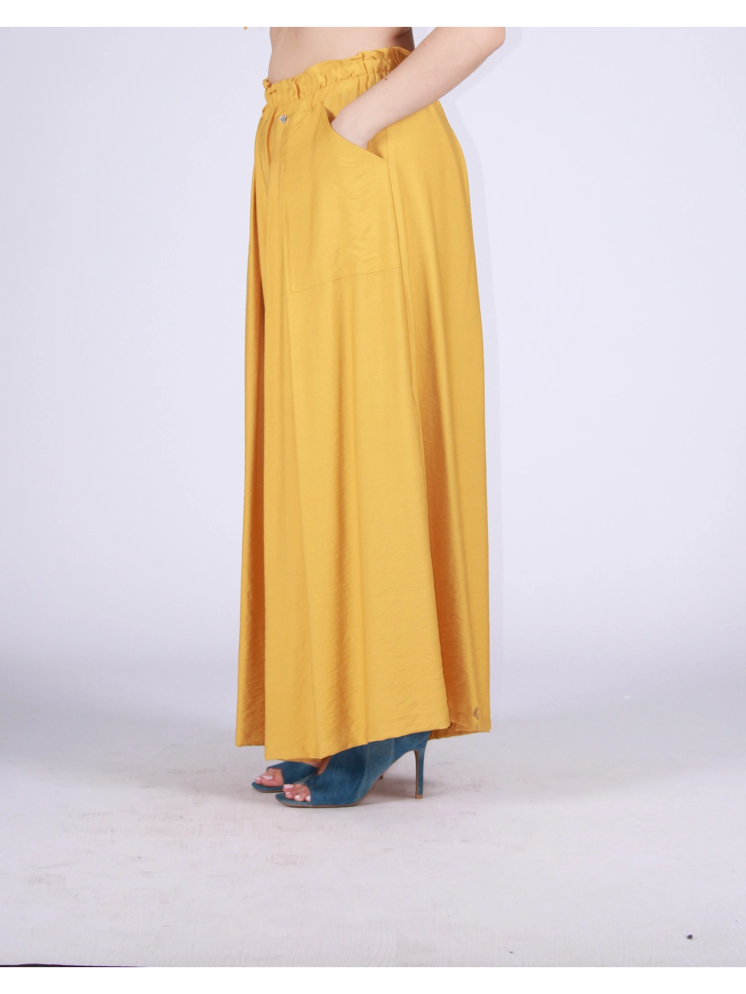 GONNA GAUCHO IN VISCOSA, AMPIA E FLUIDA, DAL VOLUME MORBIDO E SCENOGRAFICO. LINEA SVASATA CON PIEGHE IN VITA CHE CREANO MOVIMENTO E LEGGEREZZA AD OGNI PASSO. CINTURA ELASTICIZZATA PER UN FIT CONFORTEVOLE E ADATTABILE, CHE VALORIZZA LA SILHOUETTE SENZA COSTRINGERE. LUNGHEZZA MIDI/OVER CHE DONA ELEGANZA E VERSATILITÀ, PERFETTA SIA PER LOOK CASUAL-CHIC CHE PER ABBINAMENTI PIÙ RICERCATI. LA MODELLA È ALTA 170 CM E INDOSSA UNA TAGLIA I.