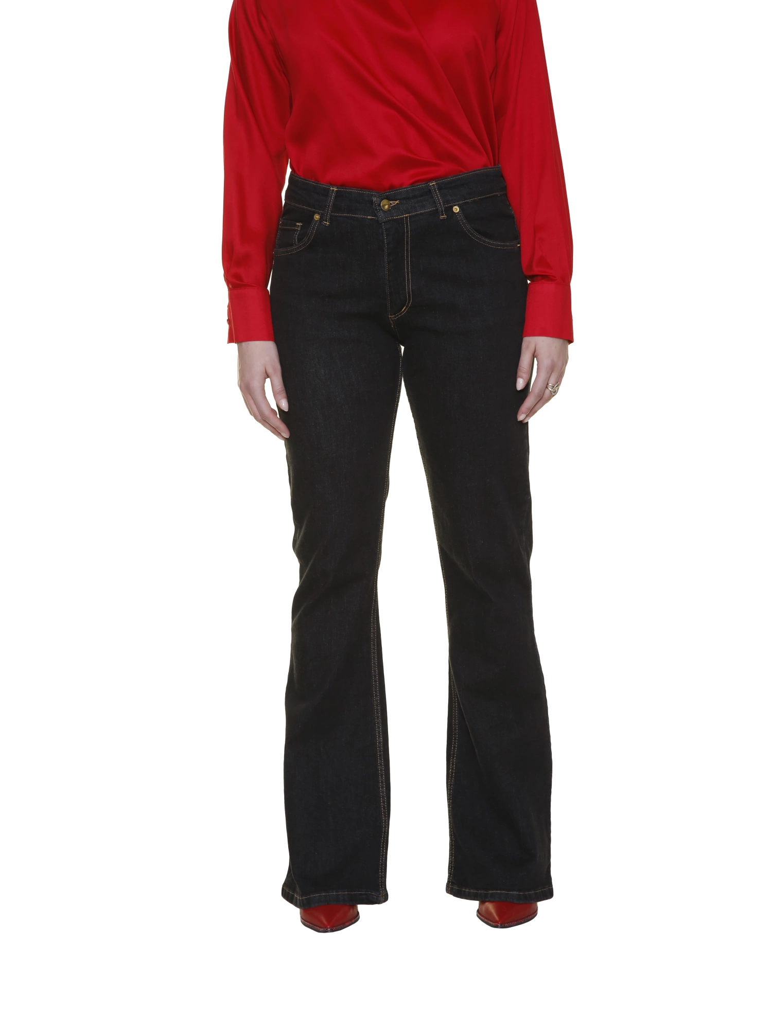 Modello a zampa 5 tasche in cotone elasticizzato - Vestibilità regular - Vita alta con passanti - Chiusura centrale con bottone e cerniera nascosta - Dettaglio cuciture a contrasto - Logo posteriore ricamato in cintura - Composizione 98%CO 2%EA - Taglie italiane 62-68 - La modella è alta 178 cm e indossa la taglia 48