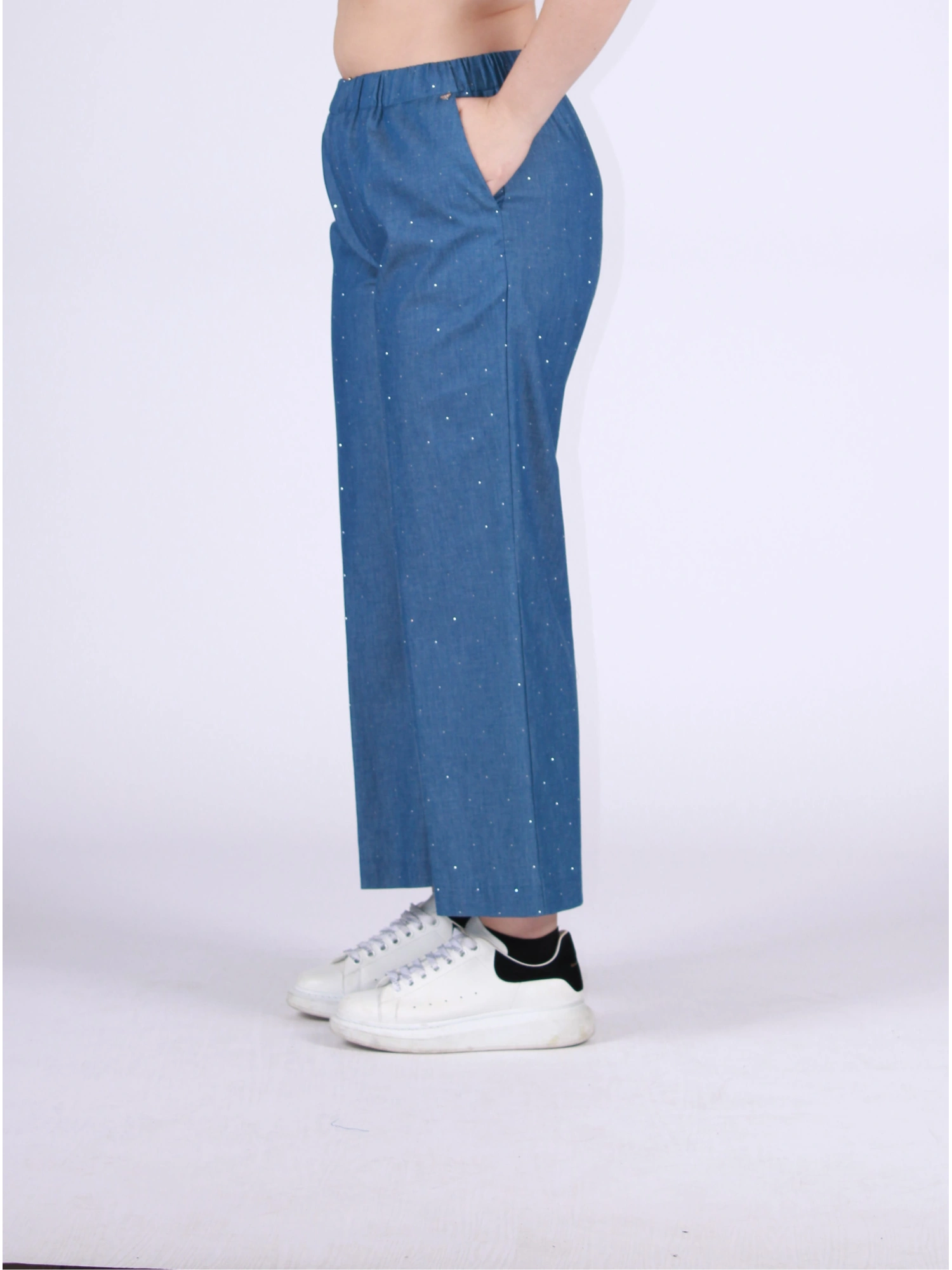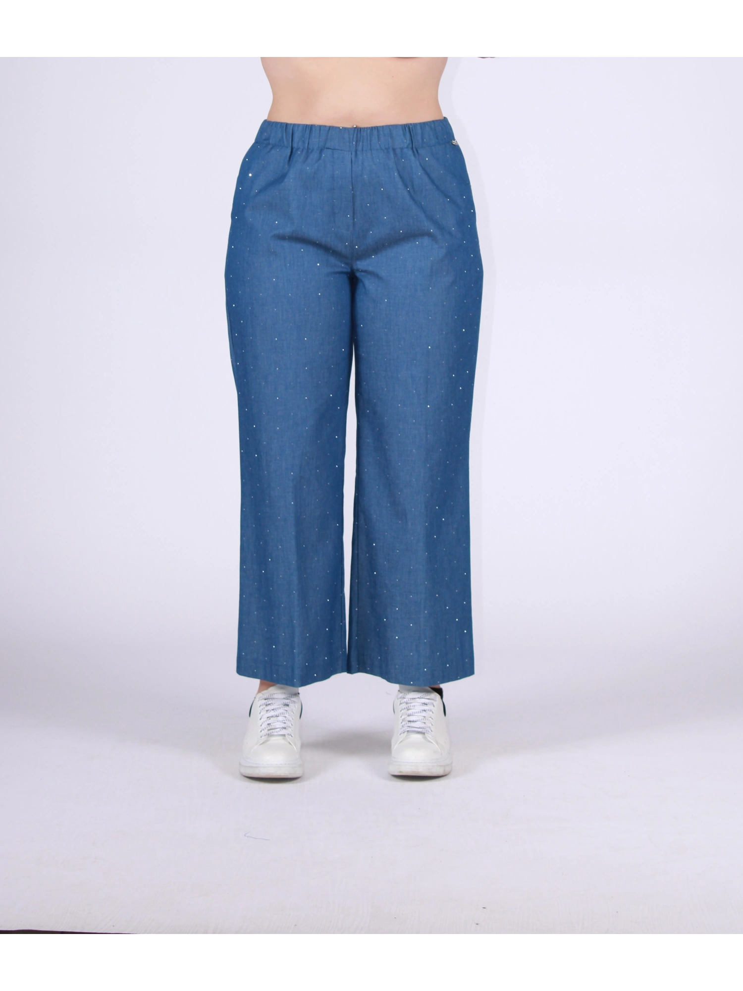 PANTALONE JEANS DAL TAGLIO AMPIO E FLUIDO, PENSATO PER UN’ELEGANZA RILASSATA MA DECISAMENTE CONTEMPORANEA. LA VITA ELASTICIZZATA GARANTISCE COMFORT E VESTIBILITÀ, MENTRE I MICRO BRILLI DISCRETI DONANO UN TOCCO DI LUCE RAFFINATA. UN CAPO VERSATILE E FASHION, PERFETTO DA INDOSSARE SIA IN COORDINATO SIA COME PROTAGONISTA DEL LOOK. LA MODELLA È ALTA 170 CM E INDOSSA UNA TAGLIA 48.